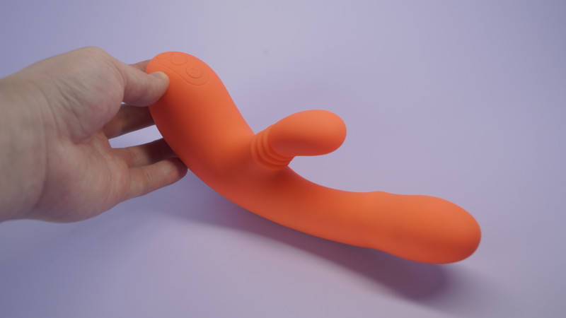 Верхняя кнопка отвечает за включение язычка в вагинальной части, нижняя вибрацию в вагинальной и клиторальной частях, единоразовым нажатием на кнопку включения можно управлять стимуляцией в клиторальной части.