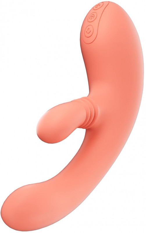 Верхняя кнопка отвечает за включение клторальной части, за включение язычка вращения на 360, единоразовым нажатием на кнопку включения можно управлять дополнительной вибрацией в вагинальной части.